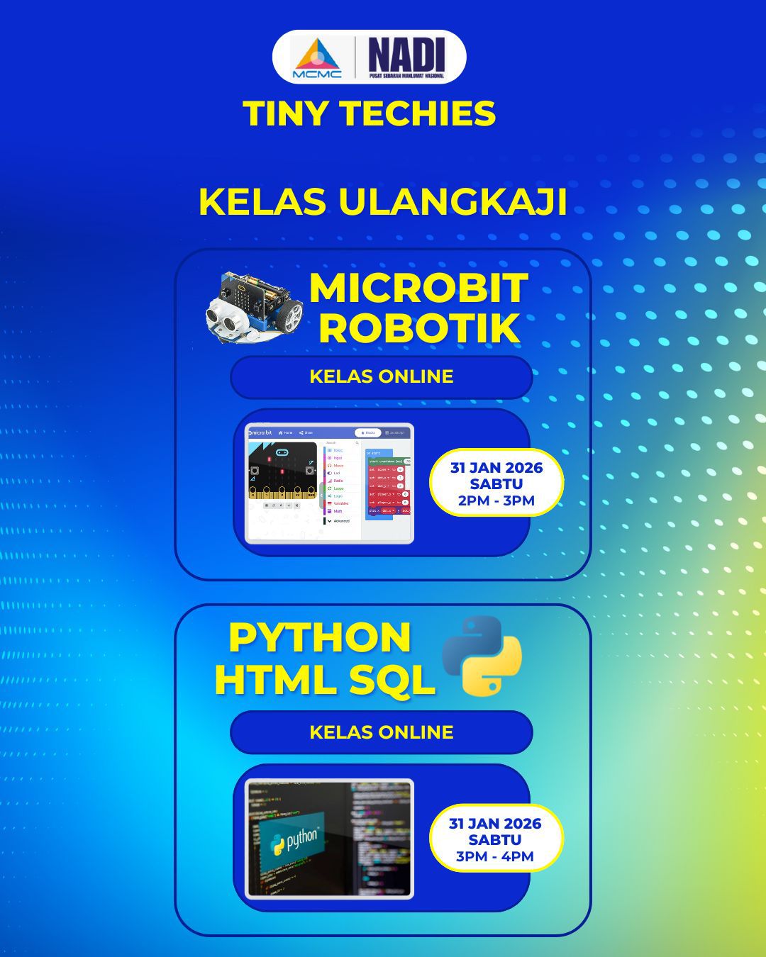 TINY TECHIES – Kelas Ulangkaji (Atas Talian) akan dianjurkan khas untuk murid Sekolah Rendah dan Sekolah Menengah seperti ketetapan berikut: TINY TECHIESKELAS ULANGKAJI (ATAS TALIAN)Program pembelajaran teknologi untuk murid Sekolah Rendah dan Sekolah Menengah Micro:bit & Robotik (Sekolah Rendah)Ulangkaji asas […]